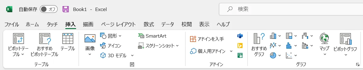 Excelではデータを選択した後,[挿入]タブから様々なグラフを作成することができます.