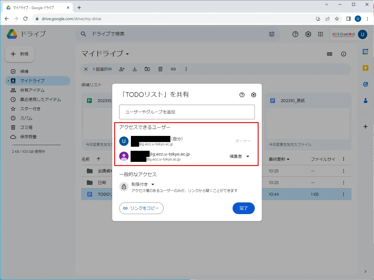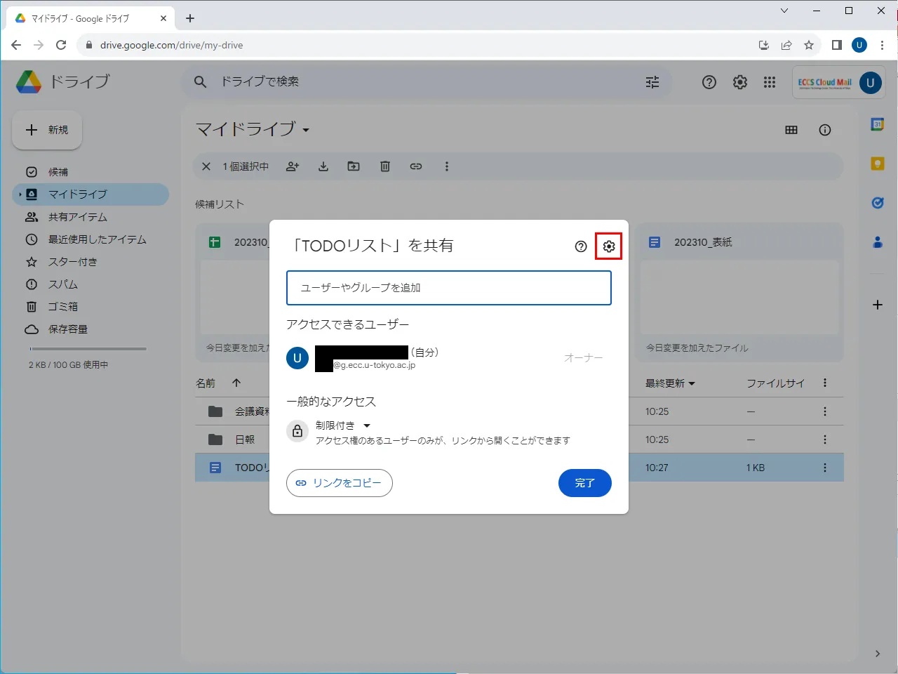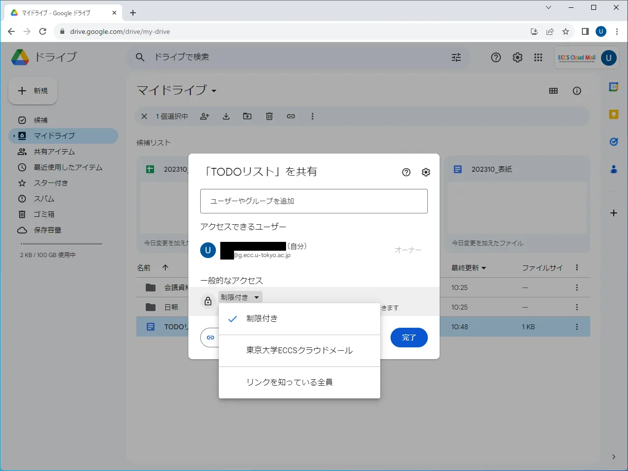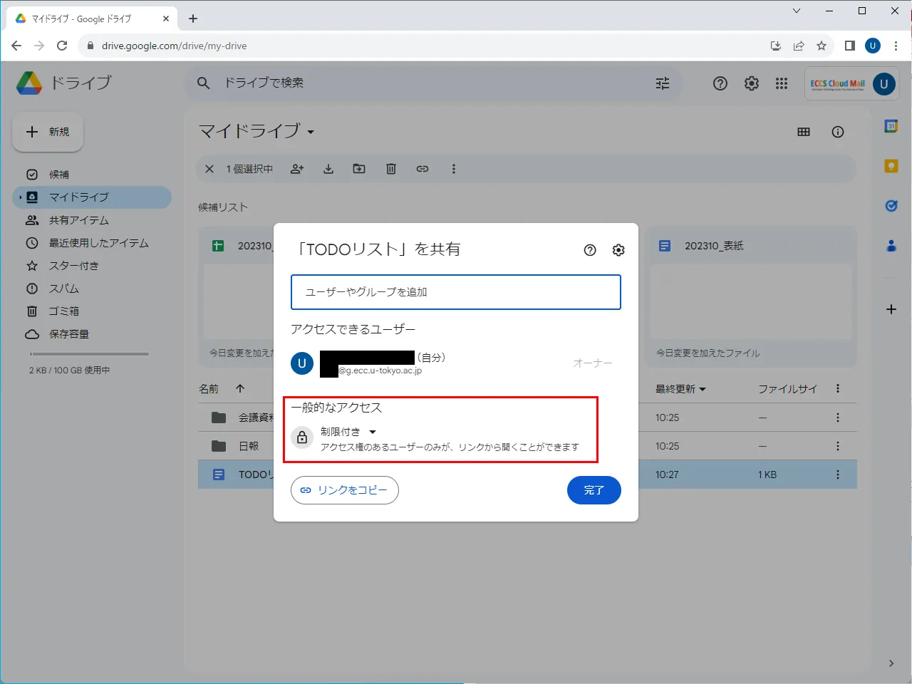 共有を解除したい場合は,設定を「東京大学ECCSクラウドメール」または「リンクを知っている全員」から「制限付き」に戻してください.