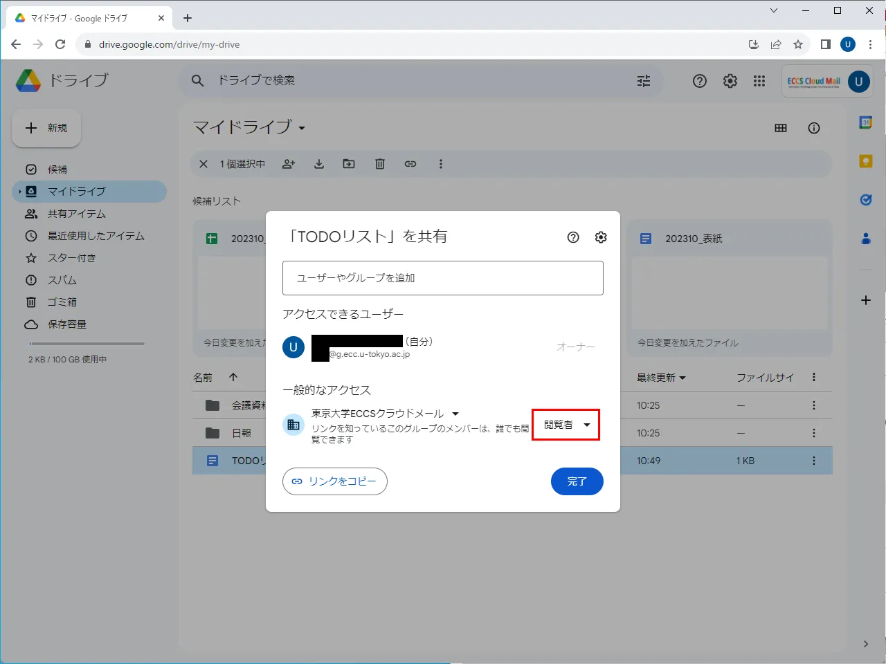 • 誰でもアクセスできるようにする設定と,東京大学のECCSクラウドメールのアカウントを持っている人に限り誰でもアクセスできるようにする(ECCSクラウドメールのアカウントを持っていない人を除外する)設定の,2つの設定が可能です.
