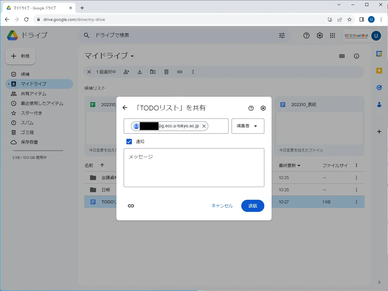 • 「通知」をオンにしている場合,その下の「メッセージ」欄に入力した内容が通知メールに記載されます.共有相手に伝えたい内容があれば,入力してください.