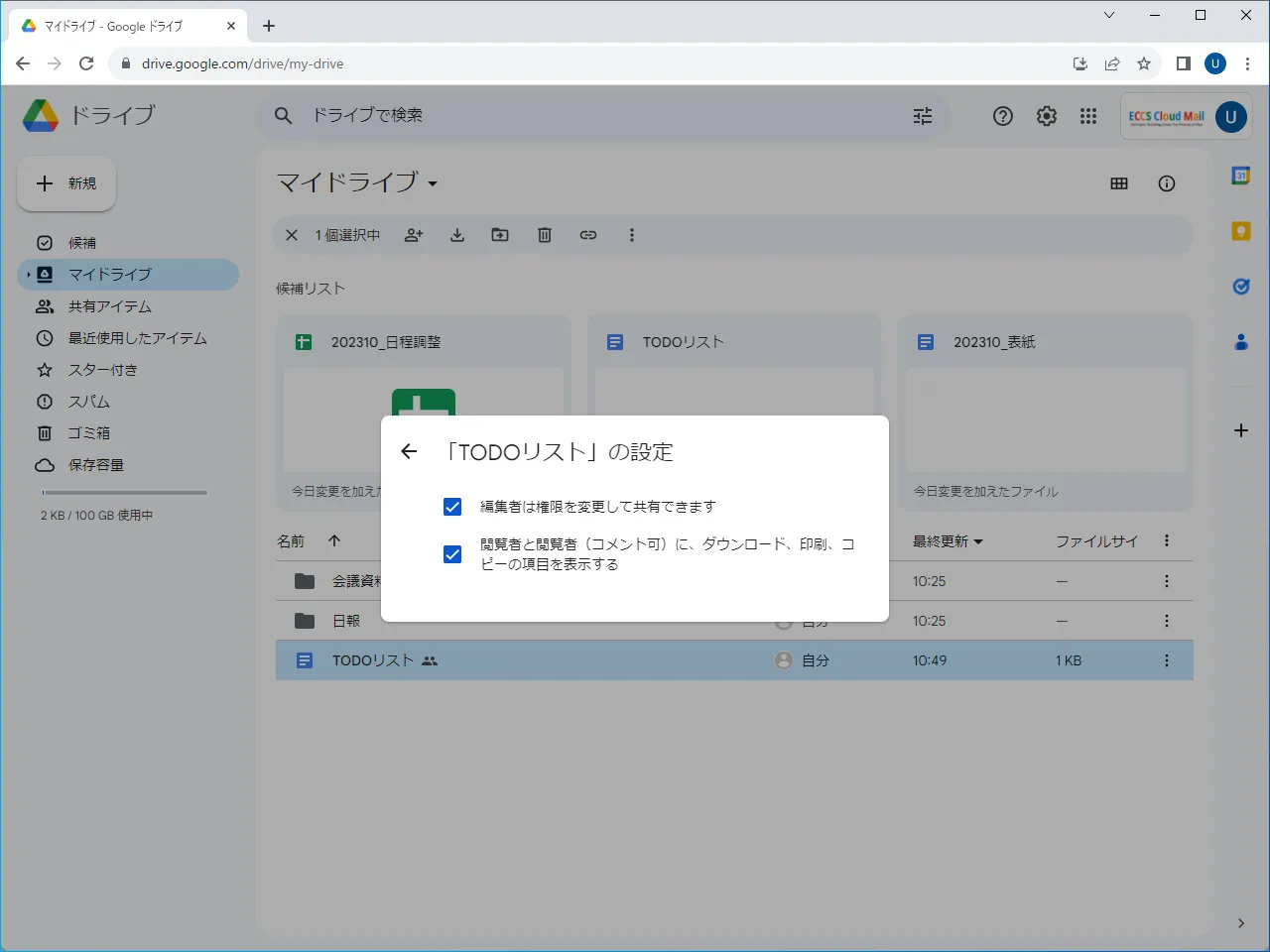 • チェックボックスがオンの状態(デフォルト)では,「閲覧者」「閲覧者(コメント可)」のアクセス権を持っている共有相手は,そのファイルのダウンロードなどが可能です.オフにすることで,ダウンロードなどを禁止することができます.