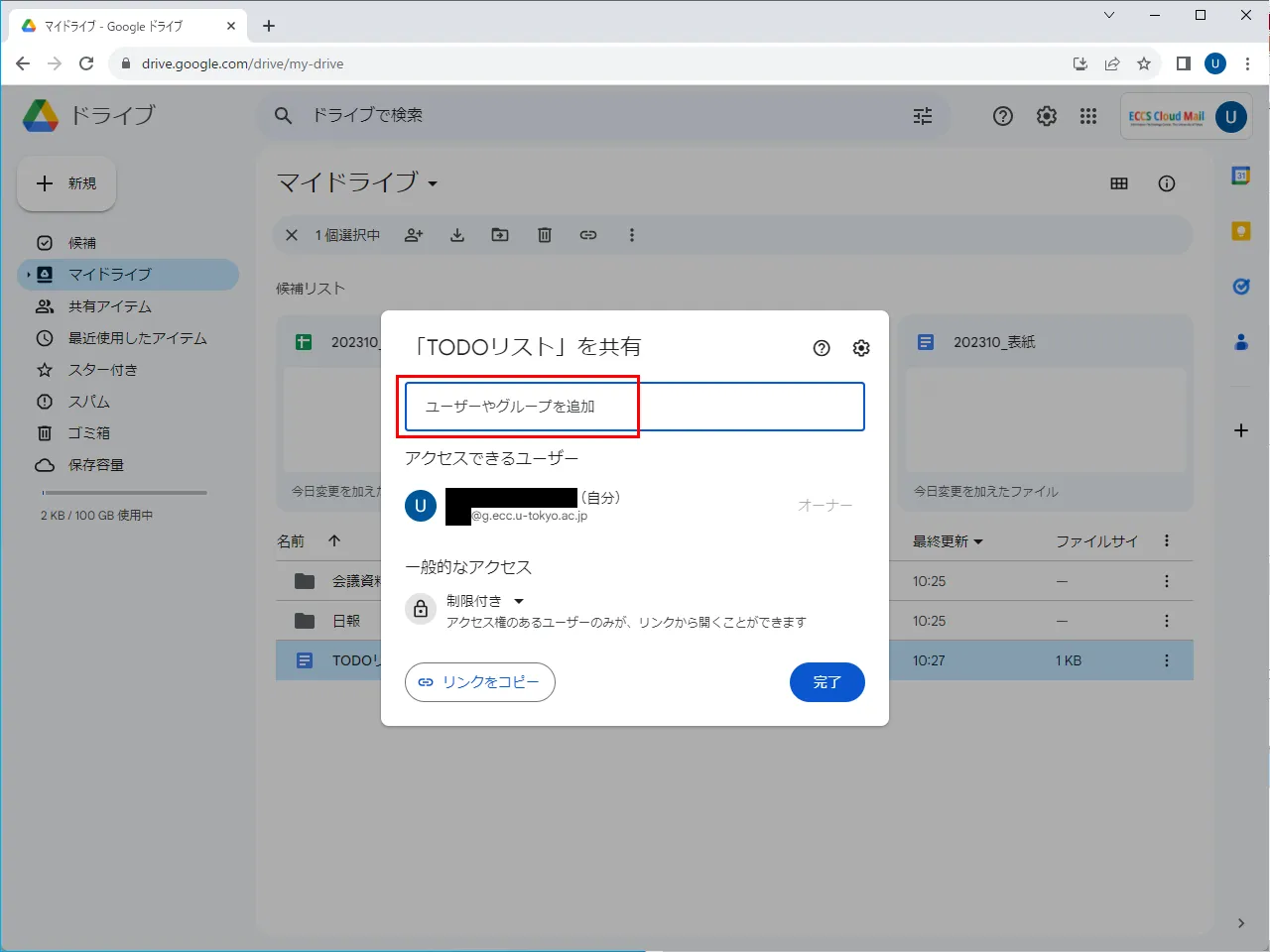1. 上の手順で共有設定画面を開いた後,「ユーザー名やグループを追加」欄に共有相手のメールアドレスを入力してください.