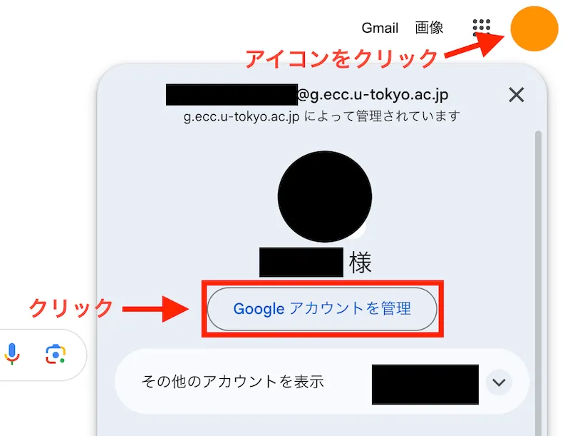 2. 右上のアイコンをクリックしてメニューを開き,「Googleアカウントを管理」をクリックしてください.