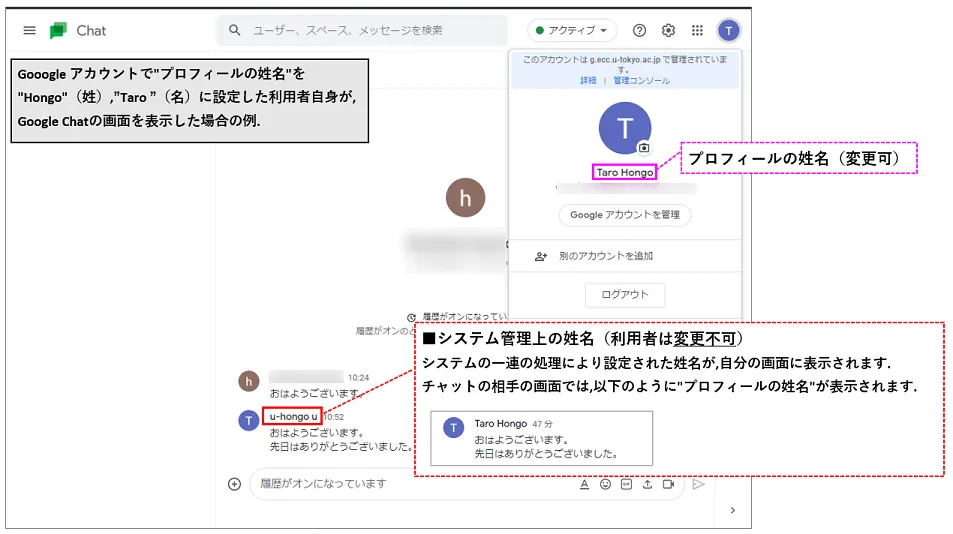2022年5月の時点では,Google Chatでのみ,このような問題が確認されています.Google Chatの場合,自分の画面では「システム管理上の姓名」が表示されますが,相手の画面では「プロフィールの姓名」が表示されます.自分の画面と相手の画面で表示される姓名が異なるため紛らわしいですが,想定された挙動ですので,ご理解ください.