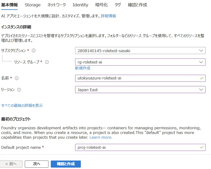 • リソースグループ:ここでは新規にrg-roletest-aiというリソースグループ名で作成し,以下に作成される各リソースをまとめます.まとめられたリソースは,権限の継承や削除などを一括で対応することが可能となります.