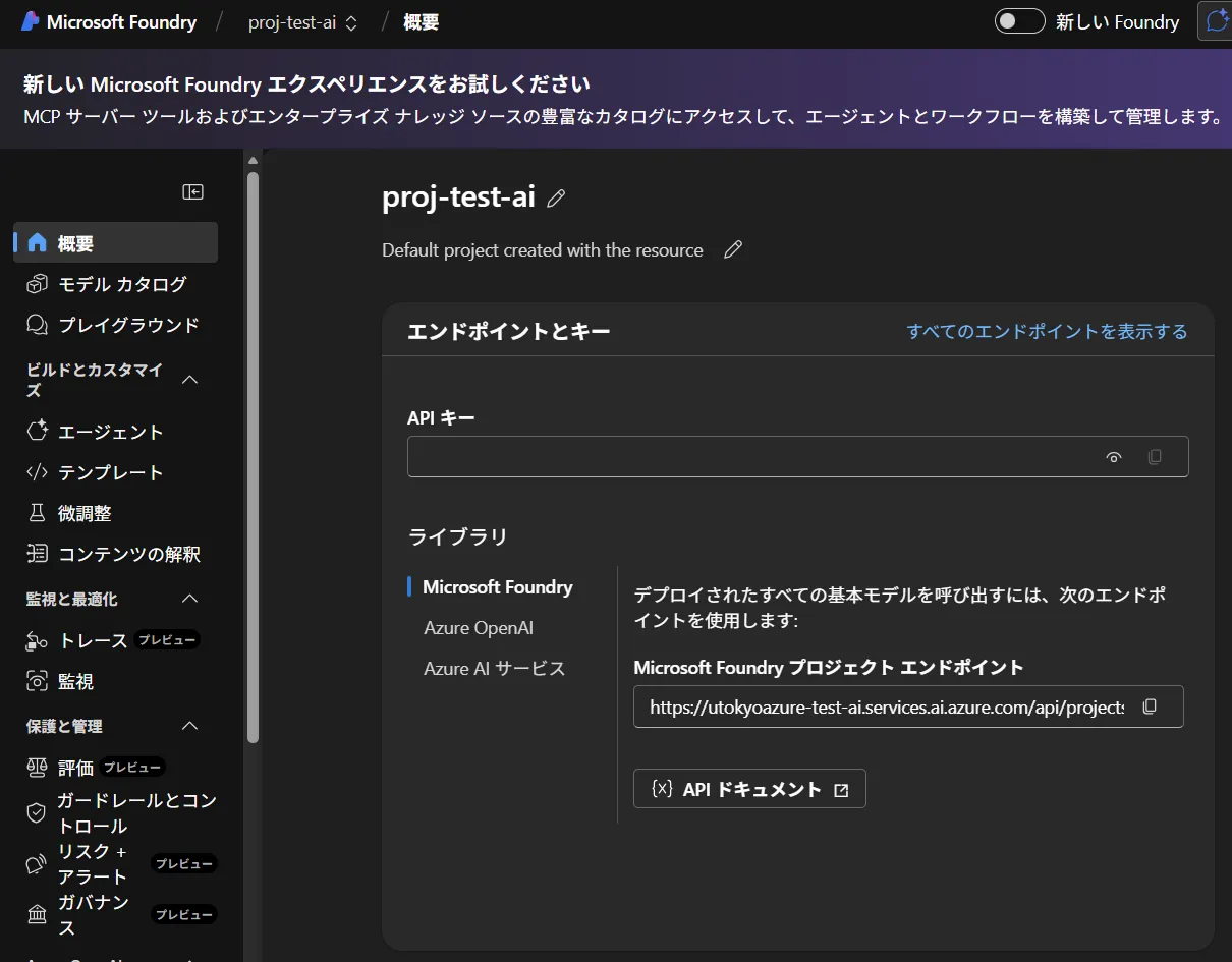 • Foundryポータル上部にある新しいFoundryスイッチを切り替えると,UIが新しいバージョンに更新されます.本ページでは旧バージョン(クラシック版)で説明していますのでご注意ください.新しいバージョンのUIで使う場合は,Microsoft Learn のMicrosoft Foundry(新しい)ポータルを参照してください.