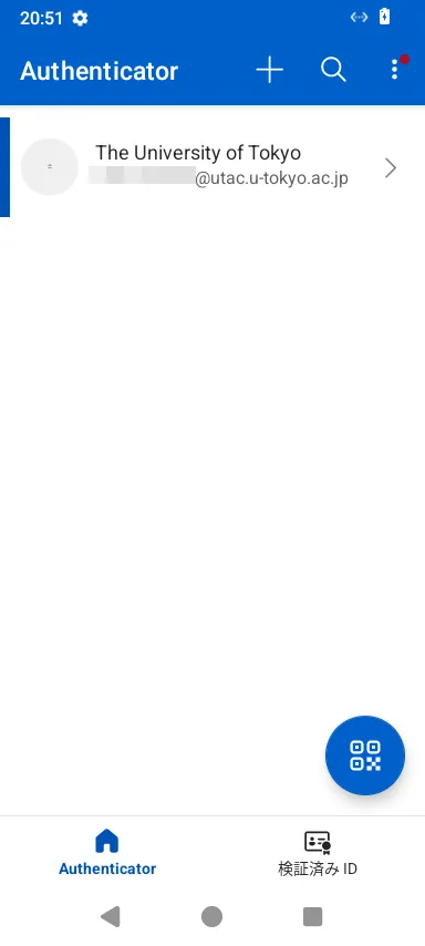 - 画像1枚目または2枚目のように,「QRコードをスキャンします」という項目または右下のQRコードボタンが表示されている場合は,それを押してください.そうではなく画像3枚目のような画面が表示されている場合は,画面右上の「+」を押してから,「職場または学校アカウント」「QRコードをスキャン」の順に選択してください.いずれの場合もカメラの利用を許可するか尋ねられることがありますが,その際は許可してください.