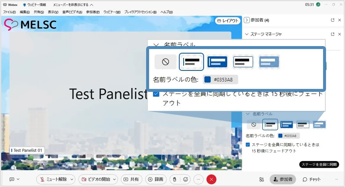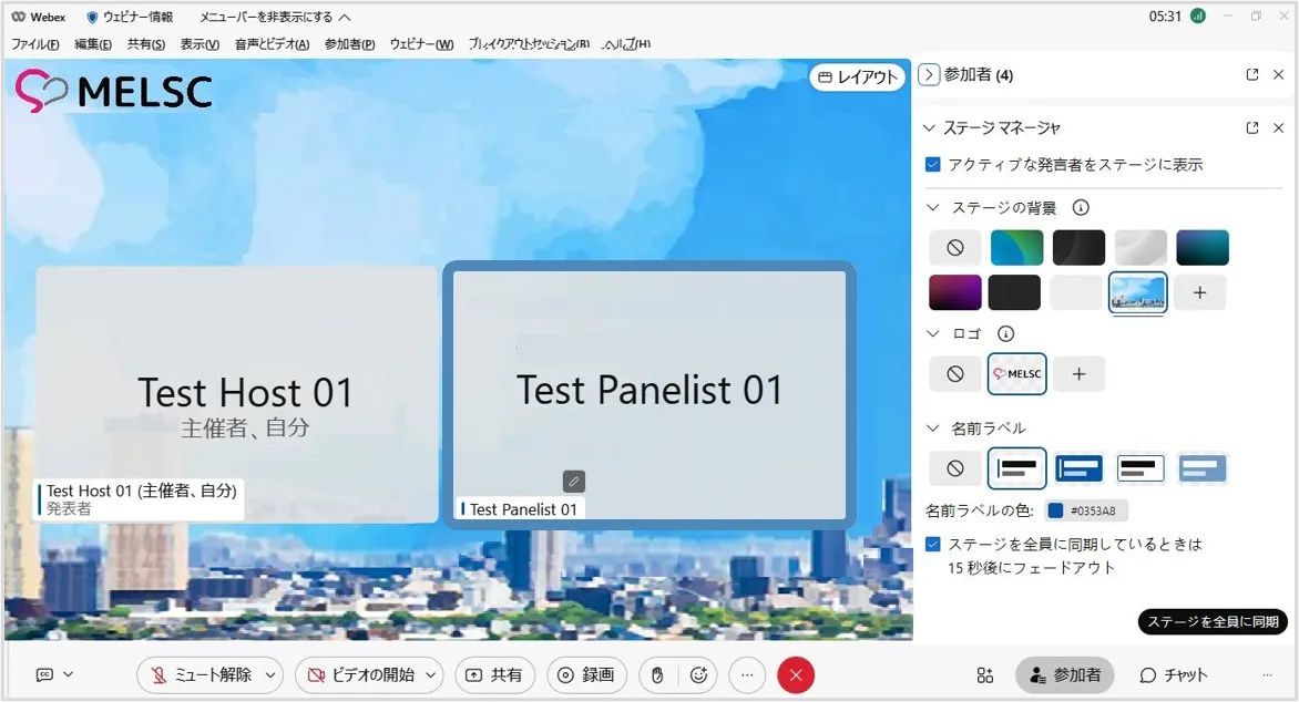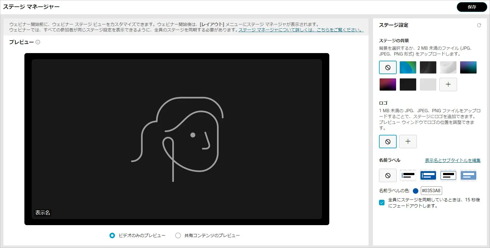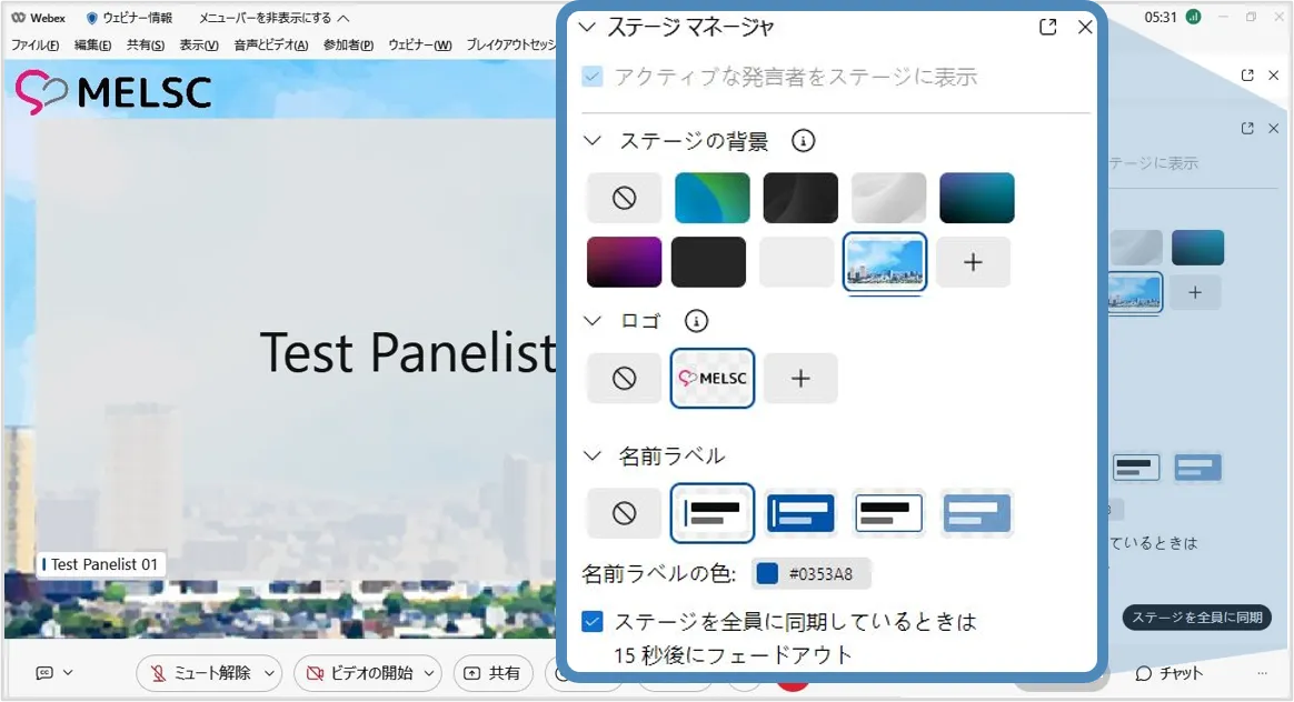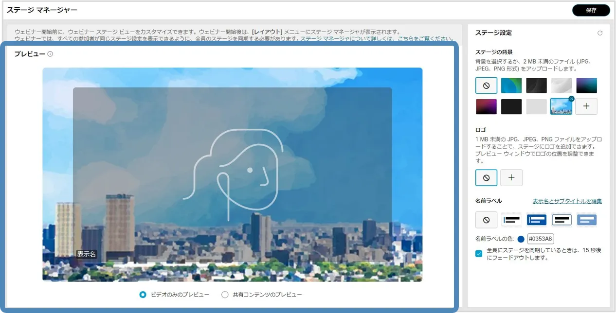 ステージマネージャー機能を使用すると,背景やロゴ・カスタマイズした名前ラベルをステージに設定でき,効果的なウェビナーの開催に貢献します.