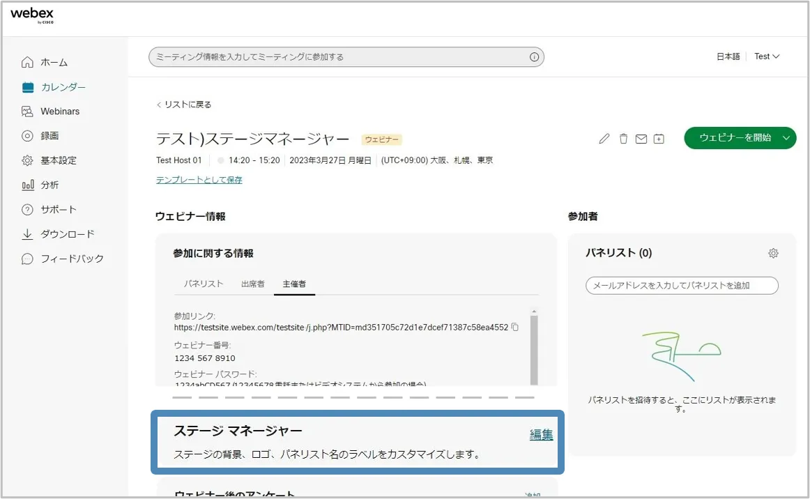 - ウェビナー情報内から「ステージマネージャー」の「編集」をクリックします.